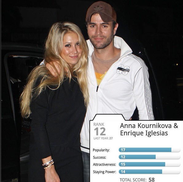 سایت معتبر و مشهور Zi*bio بهترین زوجهای سبلریتی روبر اساس فاکتورهایی از جمله محبوبیت و موفقیت معرفی کرده که انریکه ایگلسیاس و انا کورنیکووا در رتبه ۱۲ از ۱۰۰ زوج این لیست قرار دارند…این در حالیه که پارسال در رتبه ۲۷ قرار داشتند… در توضیحات سایت دو جمله جالب ومهمی که به چشم میخورد اول اینکه سال پیش رو رو برای انریکه سالی بزرگ پیش بینی کرده وهمچنین حدس زده د شاید در این سال خبر رسمی ازاین زوج برای بچه دار شدنشون بشنویم….